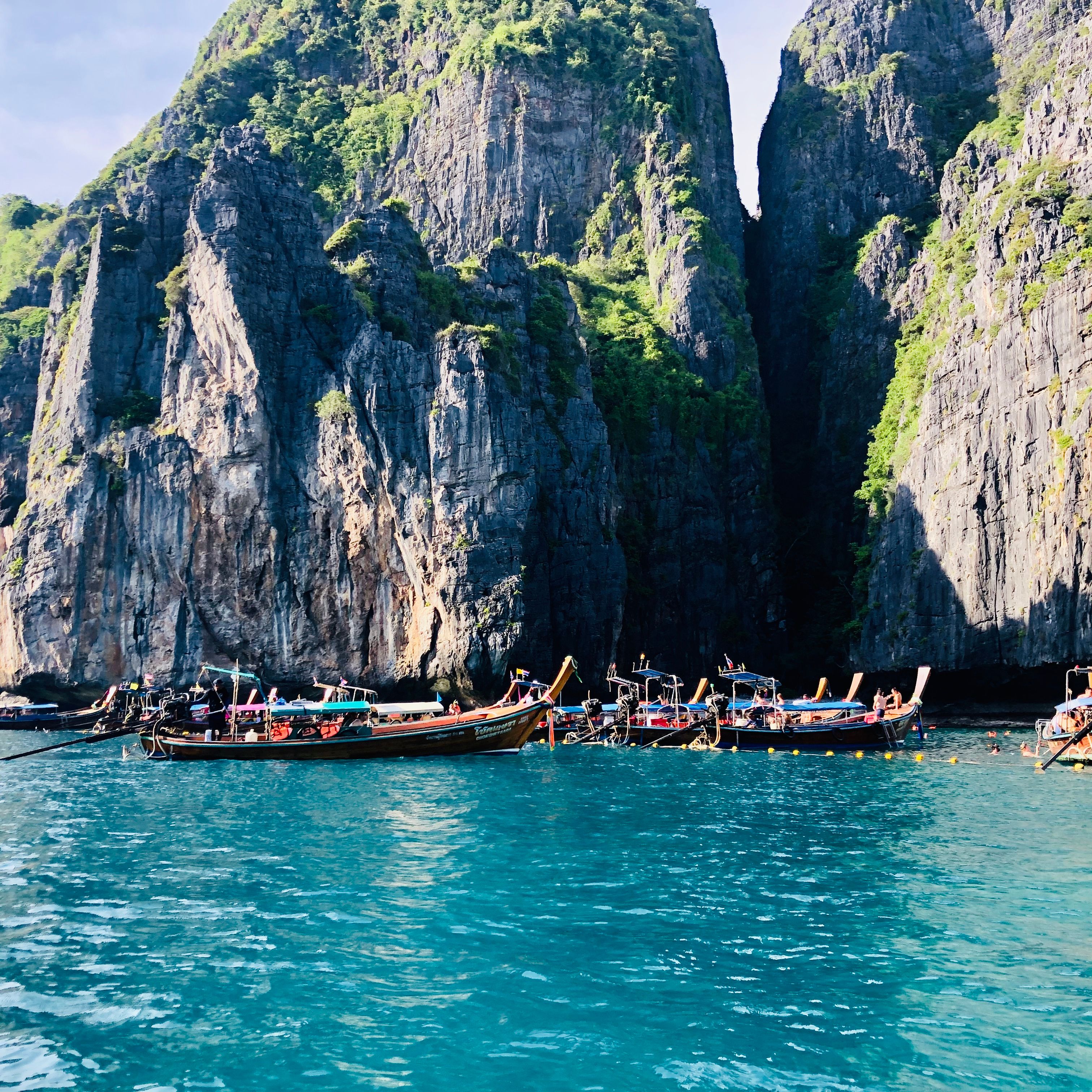 The boat ride itself becomes part of the experience. You leave early, when the air still feels soft, and as the boat cuts across the water, Phuket slowly disappears behind you. What replaces it feels more dramatic. Cliffs rise straight out of the ocean and the water shifts between shades of blue that do not feel entirely real.